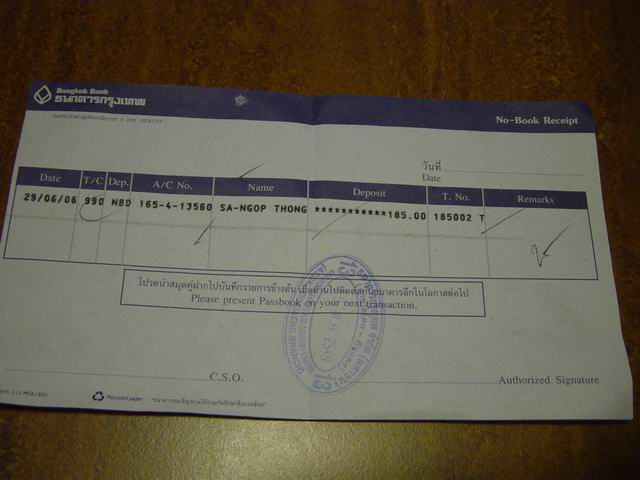 คำตอบที่ 108 คุณหนุ่มครับ ผมได้รับหนังสือเรียบร้อยแล้วครับ วันนี้ไปโอนเงินให้แล้วนะครับ 185 บาท ที่ ธนาคารกรุงเทพ สำนักงานใหญ่ ลองเช็คดูนะครับ ผมอยู่คำตอบที่ 71 ครับ ชื่อนายเลิศศักดิ์ เลียวเสวก (แผนกการเงิน) (05-815-5153) ขอบคุณมากครับ