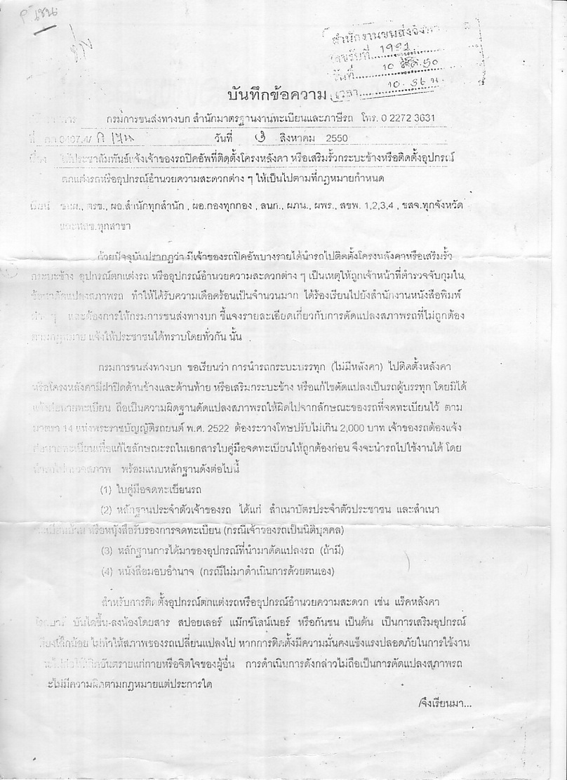 กรมการขนส่ง ชี้แจงว่า รถกระบะที่ใส่หลังคาแล้วถูกตำรวจจับ ต้องดูสมุดคู่มือประจำรถว่า เจ้าของรถจดทะเบียนรถประเภทไหน ถ้ามาจดทะเบียนเป็นประเภทรถกระบะ แล้วนำไปใส่หลังคา ก็ถือว่า ผิดระเบียบ ตาม พ.ร.บ.รถยนต์ พ.ศ.2522 เรื่องการจดทะเบียน ถือเป็นการต่อเติมหรือเปลี่ยนแปลงสภาพรถนอกเหนือจากที่จดทะเบียนไว้ ถูกปรับไม่เกิน 2,000 บาท ถือว่าตำรวจทำถูกต้องแล้ว