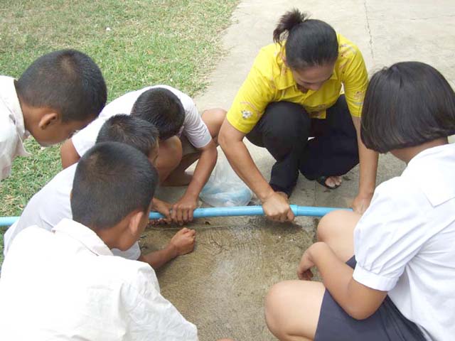 พอดีวันนี้น้ำประปาไม่ไหลจึงต้องสูบน้ำจากบ่อน้ำที่ทางโรงเรียนขุดเอาไว้ ก้เกิดเหตุท่อน้ำที่ต่อเอาไว้เกิดแตก ทั้งคุณครูและนักเรียนเลยต้องช่วยกันซ่อม ไม่งั้นไม่มีน้ำใช้แน่ ๆ