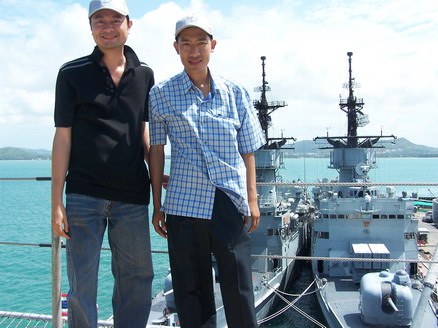 ยืนบนเรือจักกรีนฤเบศร มีเรือรบ 2 ลำให้ถ่ายรูป