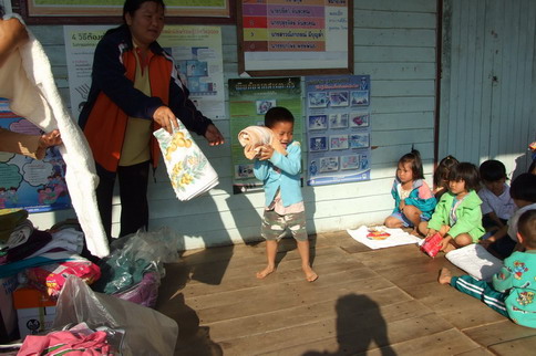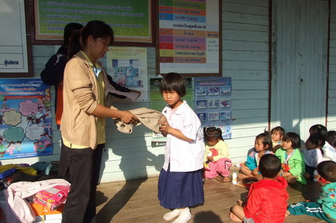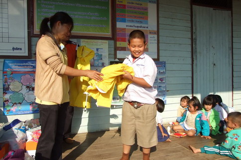 คุณครูก็ช่วยดูขนาดเสื้อแล้วเรียกเด็กที่รูปร่างใกล้เคียงกับขนาดออกมารับไป