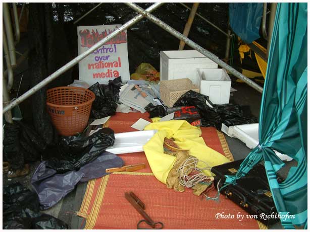 เมื่อวานมันปล้นพร้อมทำลายเวทีของเราเสียหายทั้งหมด กับทำลายโรงครัวของอโศกที่พวกป้าๆทั้งหลายหุงข้าวปลาให้พวกมันกินตอนที่โดนเจ้านายทิ้งไม่เหลียวแลสองวัน พอเราเผลอมันเอาข้าวปลาอาหารเครื่องครัวโยนลงคลองหมดเลย ทำลายทิ้งทุกอย่างทั้งถนน ปล้นตู้บริจากไปหมด น่าเสียดายที่มันปล้นใบกระท่อมไปด้วยแถมยังเอามาเรียงให้ NBT(Newin Broadcasting of Thailand) ถ่ายรูปไปลงเสียอีก