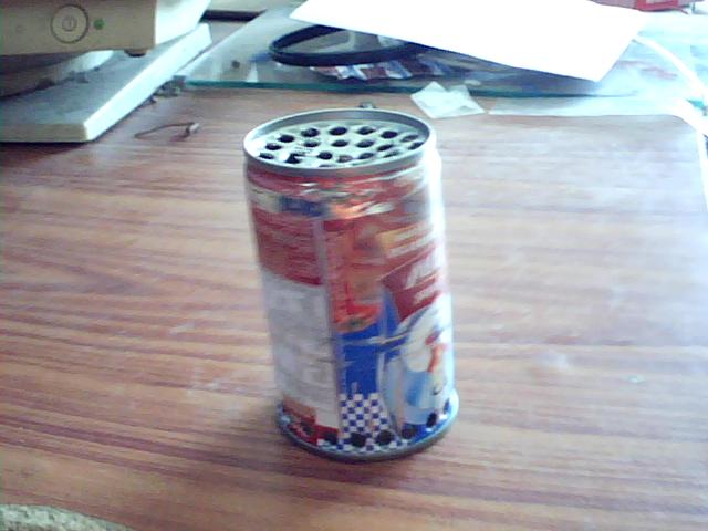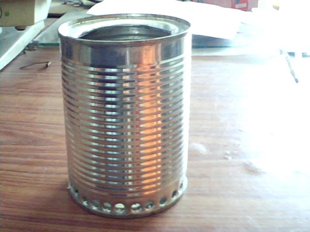 มาถึงปลากะป๋อง ปลากะป๋อง จะต้องถูกเปิดฝ้าใช้งานมาแล้ว ให้นำมาเจะรูที่ตูดกระป๋อง หลายๆรู ให้เป็นลักษณะเหมือนกับรังผิ้งของเตาอั้งโล้ ด้านบนของกระป๋อง จากขอบรอบๆ วัดลงมาประมาณ 5 มิล แล้ว เจะรูรอบๆ