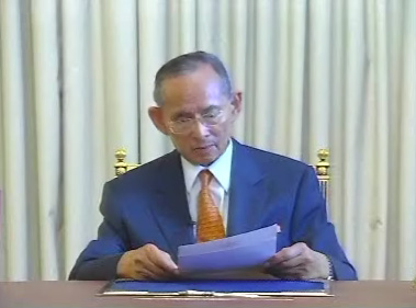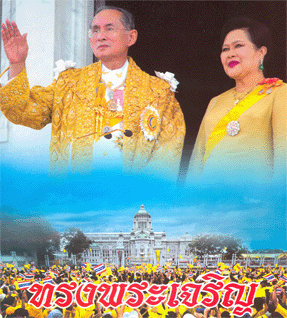 มุมบนด้านขวา มีข้อความเป็นตัวหนังสือพิมพ์ด้วยสีเหลืองว่า สวัสดีปีใหม่ ขอจงมี...ความสุข...ความเจริญ ด้านล่างขวา มีตัวเลขสีแดง ระบุวันเดือนปีที่ทรงฉายพระบรมฉายาลักษณ์ว่า 2008 12 17 / 17 : 11