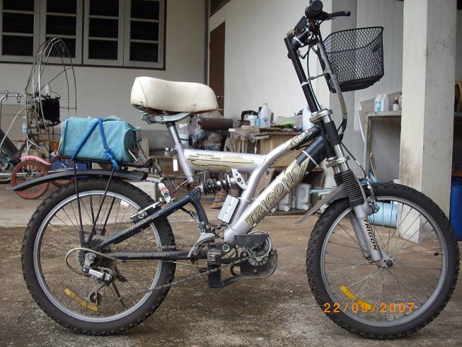 ผมเคยทำครับ ซื้อ อุปกรณืทั้งชุดจาก farsai.net ที่บ้านหม้อครับ 3000กว่าบาท ครบชุด ยกเว้น battery เหมาะสำหรับใช้ ในเมือง ระยะทางไม่ควรเกิน 10-20 กิโล ขึ้นกับขนาด battery ตอนนี้คิดๆดูแล้ว รู้สึกจะแพงกว่าใช้เครื่องตัดหญ้า ขับคลื่อน นี่กำลังทำใช้เคื่องตัดหญ้าขับเคลื่อนอยู่ครับ
