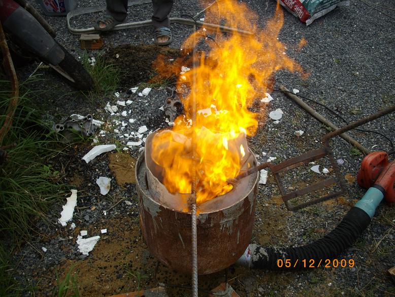 เริ่มทำเตา หลอมอลูมิเนียมด้วยถ่าน ใช้ blower ถูกๆ ก็ใช้ได้ดีครับ หล่อแบบ lost foam ทำแบบด้วย โฟมก่อน แล้วฝังในทราย บังเอิญ ทรายเปียกน้ำ ผลงานเลยไม่ค่อยดี ไม่รู้ ต้องหล่อใหม่หรือไม่