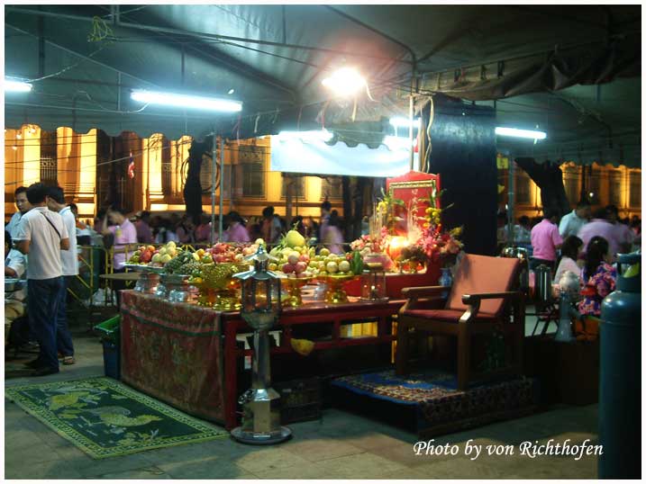 ผมเก็บกล้องเดินไปเรื่อยๆจนถึงหน้าธรรมศาสตร์พบกับเต้นท์หนึ่งตั้งโต๊ะหมู่แบบจีนถวายในหลวงผมเลยได้เอากล้องมาถ่ายรูปแรกอย่างชื่นชมในความรักในหลวงของคนไทยเชื้อสายจีนในบ้านเรา หลังจากนั้นก็เก็บกล้องเดินแหวกคนบนถนนมาตลอดเพราะรถเข็นขายของจองที่ทางเดินบนฟุตบาทไปหมดแล้ว