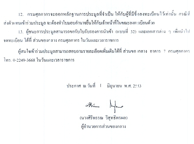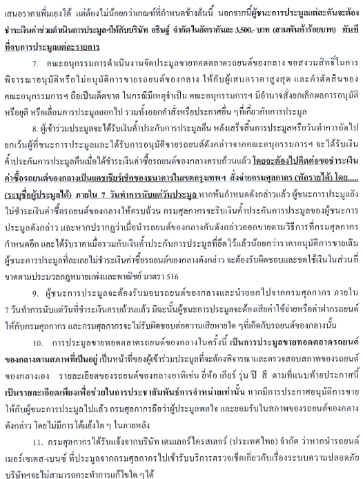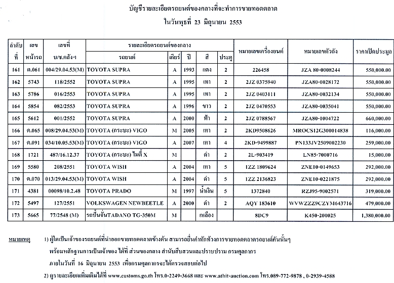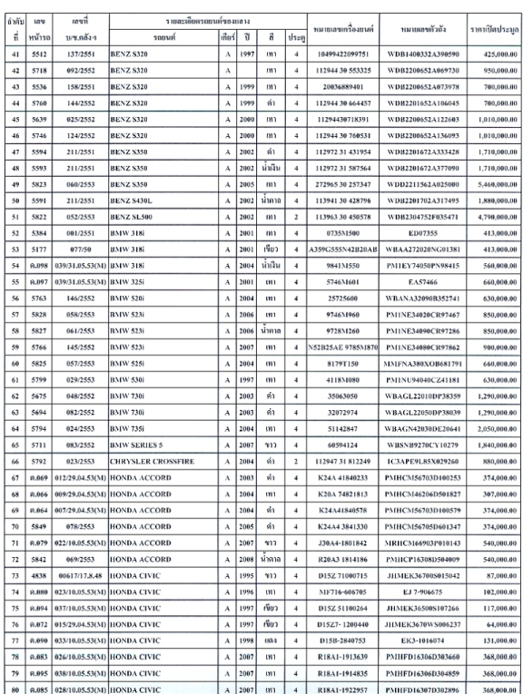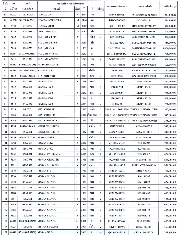 นายสมชัย สัจจพงษ์ อธิบดีกรมศุลกากร เปิดเผยว่า รถยนต์ของกลางที่กรมศุลกากรนำออกขายทอดตลาดครั้งนี้ 155 คัน ประกอบด้วย MERCEDES BENZ 56 คัน B.M.W. 25 คัน TOYOTA 21 คัน HONDA 11 คัน NISSAN 10 คัน MAZDA 10 คัน JAGUAR 8 คัน AUDI 3 คัน MITSUBISHI 3 คัน PERODUA 2 คัน MINI COOPER 2 คัน VOLKSWAGEN 1 คัน JEEP 1 คัน ROVER MINI 1 คัน และ SUZUKI 1 คัน โดยเปิดให้ผู้ที่สนใจเข้าร่วมประมูล ชมสภาพนอกของรถยนต์ของกลางที่จะขายทอดตลาด และลงทะเบียนเข้าร่วมประมูล ตั้งแต่วันที่ 23 พฤศจิกายนที่ผ่านมา ณ ส่วนของกลาง กรมศุลกากร คลองเตย