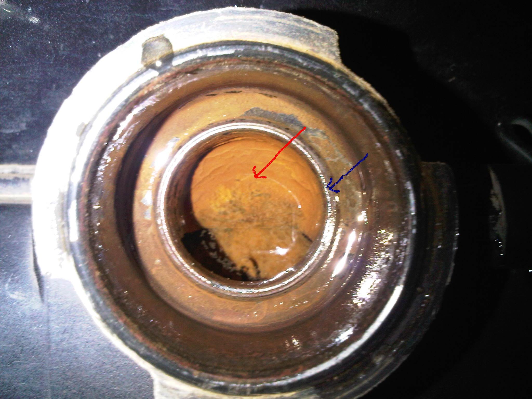 นี่แหละครับน้ำจะตกไปอยู่ตรงนั้นครับตามรูปเลย ผมมีข้อสังเกตอยู่ข้อนึงครับ ตอนเครื่องเย็นผมเติมน้ำยาจนล้นฝาทิ้งใว้ 10 นาทีมันก็จะตกไปอยู่ที่เดิมครับทำอย่างนี้ 3 รอบก็เหมือนเดิมครับ