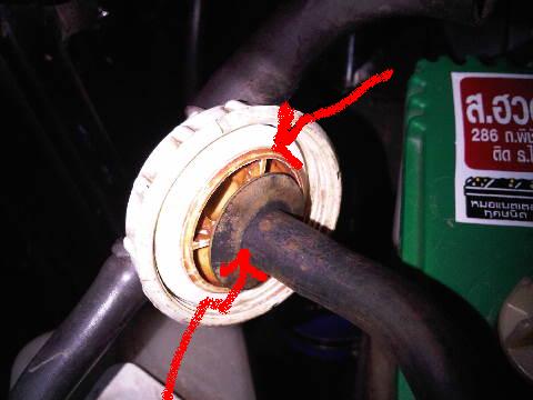 อีกจุดคือฝาหม้อน้ำมันรั่วตรงยางขอบนอกวงใหญ่ด้านบนหรือไม่ก็ขอบปากหม้อน้ำไม่เรียบมันบิดเบี้ยวโก่งตัวมันก็ดูดลมเข้ามาตรงนี้ได้เหมือนกัน ฝาหม้อน้ำบางตัวมันซีลหมุดกลางด้วยสติ๊กเกอร์กระดาษ ถ้ากระดาษมันขาดมันก็ดูดลมที่รอยกระดาษขาดนั่นด้วยอีกทาง