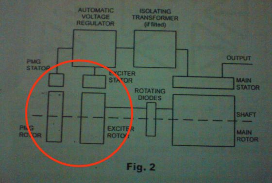 ส่วน PMG มันคือ permanent magnetic generator อีกตัวบนแกนเดียวกัน มันมีหน้าที่ self-excited และอีกหน้าที่คือ feed back ให้ชุด AVR ที่ต้องคุมกระแสที่เข้า Excite เท่านั้น ถ้าไม่มีตัวนี้กระแสที่เปลี่ยนแปลงมันจะเหวี่ยงตัวเป็นสมการ sine ที่ amplitude ลดตัวแบบ exponential บนแกนเวลา ตามสมการขั้นเบสิกของ Looping Feedback นั่นและครับ
