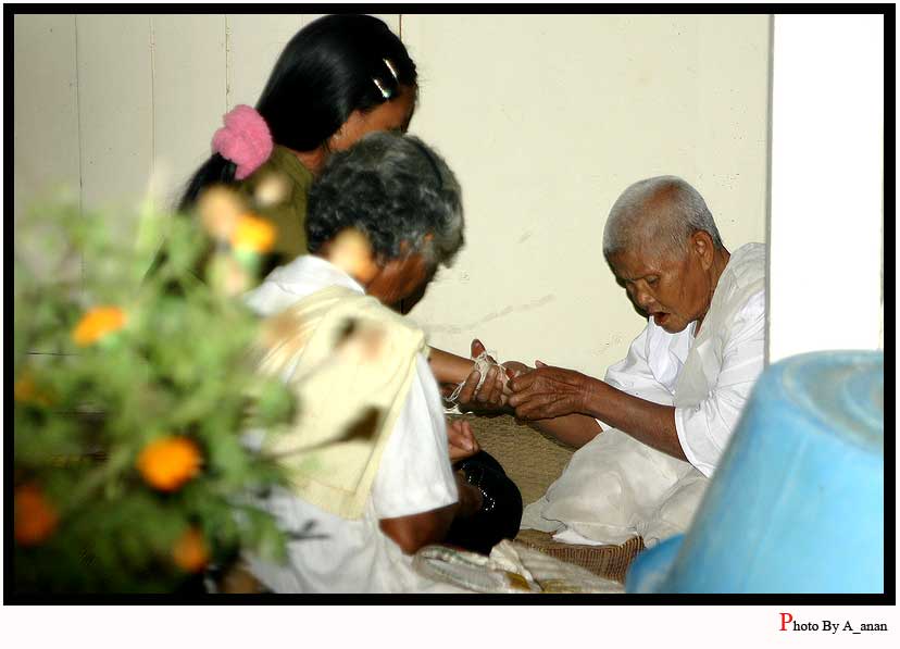 ผู้เฒ่า ผู้แก่ประจำหมู่บ้าน ทำการผูกข้อมือรับขวัญ แก่แขกที่มาเยือน