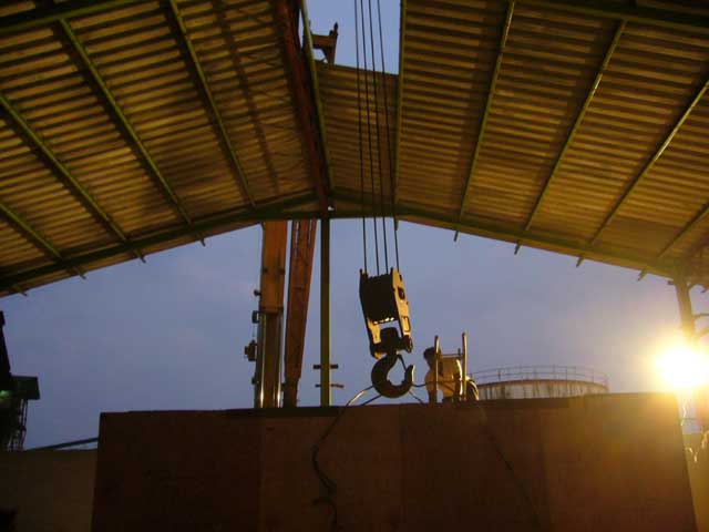 เครนยกหัวขึ้นก่อนเล็กน้อยเพราะว่าแท่นที่วางสูงกว่าพื้น แล้วเอารถดันครับ