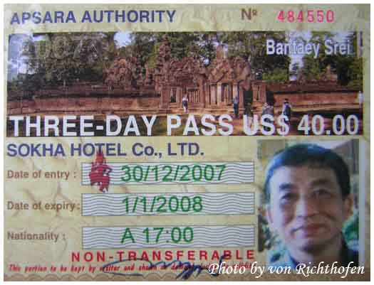 ทันทีที่ไปถึงเสียมเรียบสิ่งที่จำเป็นคือใบอนุญาตให้เข้าเที่ยวปราสาทต่างๆ จะต้องไปทำที่หน้านครวัด ค่าเข้าวันละ 20USD ถ้าเข้าสามวันคิดเพียง40USD ผมไปทำหลัง 17.00น. วันนั้นเข้าฟรีเพราะนับวันรุ่งขึ้นเป็นวันแรกทำให้ผมเข้าดูดวงอาทิตย์ตกที่พนมบาเก็งได้ทันทีโดยไม่ต้องจ่ายเพิ่ม