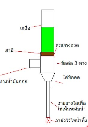 ด้านออกอาจจะใส่ก๊อกไว้แล้วปรับเอาเมื่อกำหบดอัตราการไหลของน้ำมัน แต่ด้านบนต้องให้น้ำมันเต็มตลอด ไปคิดต่อเองว่าจะทำยังไงเป็นการบ้าน
