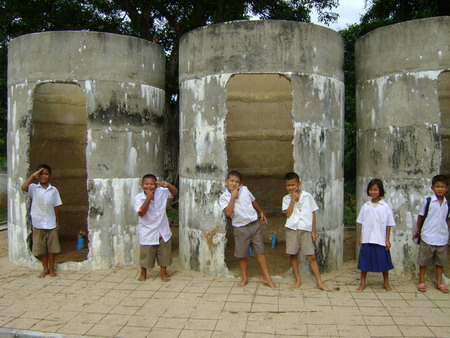 ...นักเรียนโรงเรียนวัดวังบุญ....สังเกตความก้าวหน้าการดำเนินการก่อสร้างห้องน้ำใหม่ อย่างตื่นเต้น .....