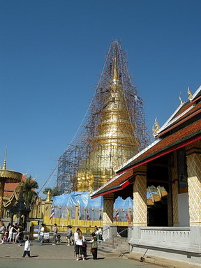 จากเชียงใหม่ผมใช้เส้นทางเลียบทางรถไฟผ่านสถานีรถไฟสารภีจนถึงลำพูน เพื่อหลีกเลี่ยงความจำเจและต้องการพบสิ่งใหม่ๆ ครับ มากราบไหว้วัดพระธาตุหริภุญชัย พระธาตุประจำปีเกิด กำลังซ่อมแซมองค์พระธาตุอยู่พอดี