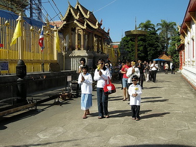 ทำทักษิณาวรรตสามรอบ ก่อนถวายดอกไม้ ธูป เทียน เห็นบางคณะมากันหลายคนก็แห่ผ้าคลุมพระธาตุ ดูสีหน้าของแต่ละคนแล้ว บ่งบอกถึงความสุขได้ดี