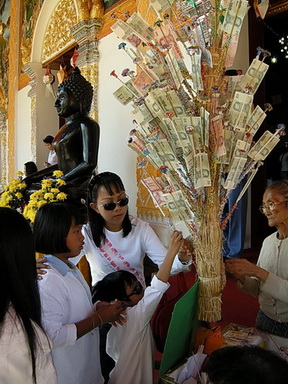 ทำบุญผ้าป่าปิดทองพระธาตุ จะเห็นได้ว่าญาติโยมแก่เฒ่าแล้วก็ยังมาช่วยเหลือวัด
