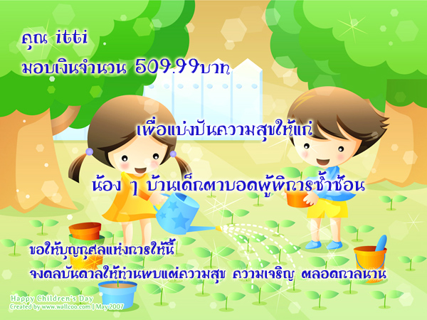 ดังนั้นปีนี้ผมจึงเลือกที่จะช่วยเหลือมูลนิธิธรรมิกชนในพระบรมราชูปถัมภ์ที่ทำโครงการ บ้านเด็กตาบอดผู้พิการซ้ำซ้อนขึ้นสักงานหนึ่ง ที่นี่ได้เงินช่วยเหลือไม่ถึงสิบเปอร์เซ็นต์ของค่าใช้จ่ายแต่ละปี นอกจากนั้นต้องพึ่งพาความใจบุญผู้บริจาคให้บ้านหลังนี้อยู่ได้