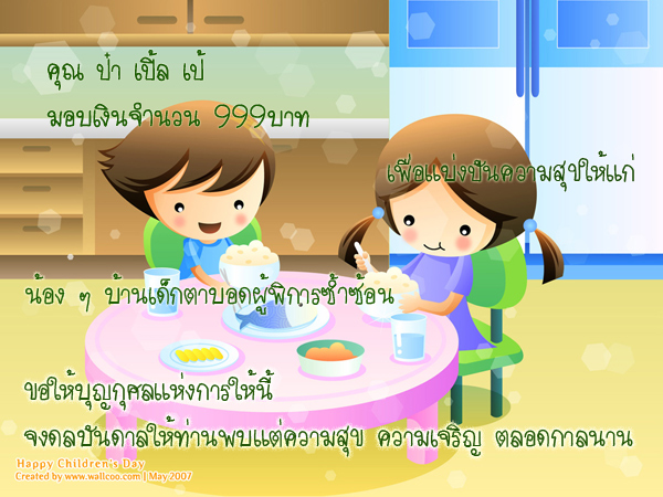 ดังนั้นปีนี้ผมจึงเลือกที่จะช่วยเหลือมูลนิธิธรรมิกชนในพระบรมราชูปถัมภ์ที่ทำโครงการ บ้านเด็กตาบอดผู้พิการซ้ำซ้อนขึ้นสักงานหนึ่ง ที่นี่ได้เงินช่วยเหลือไม่ถึงสิบเปอร์เซ็นต์ของค่าใช้จ่ายแต่ละปี นอกจากนั้นต้องพึ่งพาความใจบุญผู้บริจาคให้บ้านหลังนี้อยู่ได้