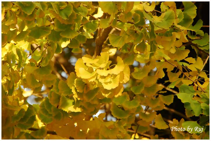ต้นแปะก้วยต้นนี้เริ่มเหลืองแซมเขียวขณะที่ต้นหน้าห้องนอนที่เรียวกังที่เกียวโตมันเหลือจนร่วงแล้ว