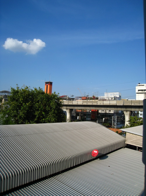 ผิงแอบยื่นกล้องออกมาถ่ายนอกหน้าต่างห้อง (กลัวกล้องหล่นเหมือนกัน แต่สีท้องฟ้าสวยดีค่ะ)