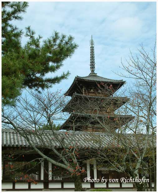 นี่ไงเจดีย์ที่เป็นสิ่งก่อสร้างไม้ที่เก่าที่สุดในโลก สร้างโดยเจ้าชายโชโตกุ Prince Shotoku ที่นำเอาศาสนาพุทธเข้ามาในญี่ปุ่นเป็นครั้งแรกเมื่อพันสามร้อยปีที่แล้ว