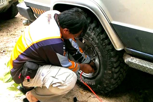 ผลจากการเหินฟ้า ทำให้ยางหลังกระแทกหินจนขอบยุบ เลยต้องเติมลมใหม่เลย