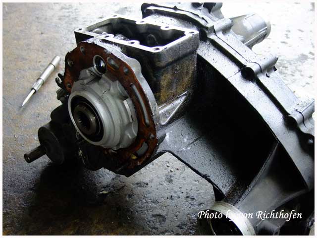 จะหลุดมันออกมาได้ก็ต้องถอดเพลาท้าย เพลาหน้า เพลาวินซ์ออกแล้วก็ถอดสกรูคันเกียร์เอาคันออกมาทั้งเกียร์หลักและเกียร์สโลว์ สกรูท้ายเครื่องท้ายเครื่องออกให้เกลี้ยง