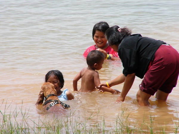 เจ้าคนกลางกำลังยื้อเจ้าปลา (โดยยืนแช่น้ำมานานกว่าจะได้วัดเบ็ดกัน)