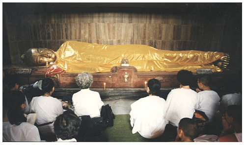 ๘. หากยังละไม่ได้ เธอควรสำเร็จสีหไสยาสน์ คือนอนตะแคงเบื้องขวา ซ้อนเท้าเหลื่อมกัน มีสติสัมปชัญญะ ตั้งใจว่าจะลุกขึ้น พอเธอตื่นแล้วควรรีบลุกขึ้น ด้วยการตั้งใจว่าจะไม่ประกอบสุขในการนอน จะไม่ประกอบสุขในการเอนหลัง จะไม่ประกอบสุขในการเคลิ้มหลับ