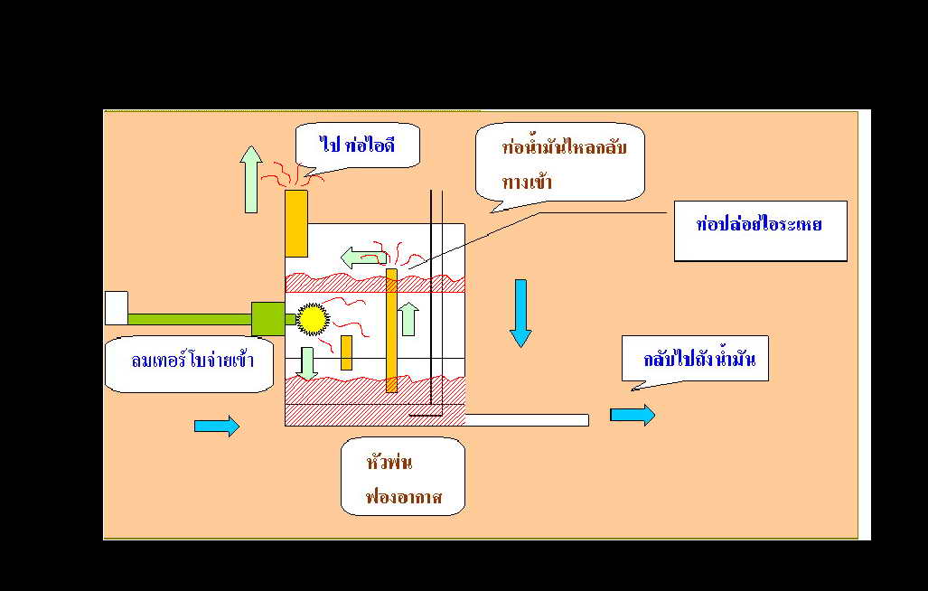 ....น้ำมันไหลจากท่อไหลกลับ เข้าแทงค์Vapor ที่ทำไว้ 2 ชั้น เจาะรูทำท่อไอระเหยไว้ ชั้นล่างเป็นชั้นน้ำมัน ชั้นบนเป็นชั้น ไอระเหย