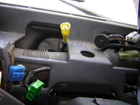 เดินสายไฟจากสวิทซ์ตัวใหม่ต่อเข้ากับสายระหัสเหลืองดำที่แผงหน้าปัด โดยเข้ากับหัวต่อแบนใหญ่ที่มีอยู่ตัวเดียว รื้อออกมาก็เห็นครับ