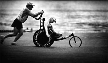 Dick Hoyt คุณพ่อวัย 65 ปี ของ Rick Hoyt ลูกชายวัย 43 ปี สองพ่อลูกจากรัฐ Massachusetts ได้เข้าร่วมการแข่งขันกรีฑามากมายถึงเก้าร้อยกว่ารายการ รวมถึงกีฬาการแข่งขันไตรกีฬาสุดโหด ที่การแข่งขันประกอบด้วย การว่ายน้ำ ในทะเล ระยะทาง 3.86 กม.ปั่นจักรยาน ระยะทาง 180.2 กม.และการวิ่งมารธอนระยะทาง 42.195 กม. ซึ่งในคนปกติก็ยากหนักหนาอยู่แล้ว แต่พ่อลูกคู่นี้ไม่ธรรมดา!!!