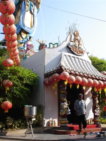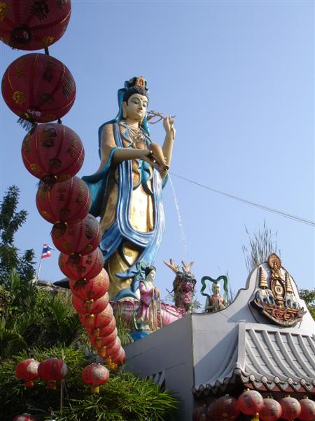 เป็นประติมากรรมที่สวยงาม และสูงที่สุดในประเทศไทย คือ สูงถึง 9.98 เมตร ประทับยืนอยู่บนฐานมังกรและดอกบัว ซึ่งอยู่บนภูเขาจำลองโดยภายในภูเขา เป็นห้องจัดไว้สำหรับผู้มาปฏิบัติธรรม