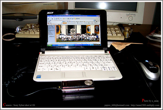 เป็นระบบ EDGE (เรียกถูกนะขอรับ) ลักษณะคล้าย TimeDrive เสียบจากช่อง USB ได้เลย มีหลายรุ่น หลายยี่ห้อ ราคาที่ซื้อ 2,200.- บาท (ต่อแล้ว) และซื้อ SimNet ของ AIS อีก 200.- บาท ได้ใช้ Net ฟรี 30 ชั่วโมง ขอรับ