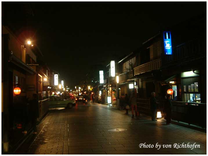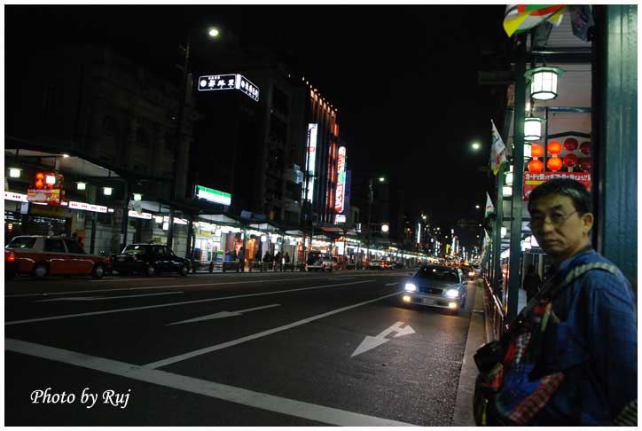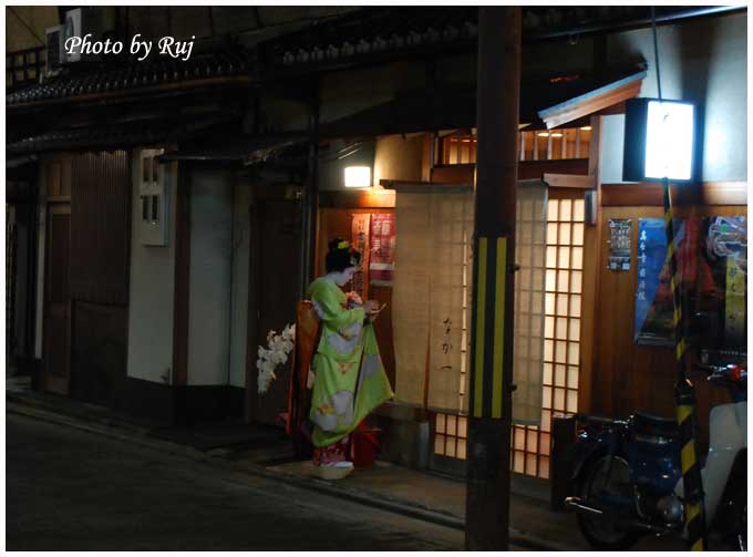 เดินเตร่ไปจนเริ่มดึก รถราบนถนนเริ่มบางตา เราจะข้ามถนนกลับไปแอบดูเกอิชาทำงานกันแล้วครับ
