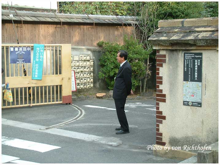 ผมเจอโรงเรียนที่อยู่ระหว่างทางเดินขึ้นวัดแล้วมีครูเวรมายืนหน้าประตูเหมือนบ้านเรานั่นแหละ แต่ครูเวรหน้าประตูแทนที่จะงับกบาลเด็กเป็นอาหารเช้า กลับทำอย่างที่ผมต้องยืนหยุดดูแบบคิดไม่ถึงว่านี่คือครูเวรของญี่ปุ่น