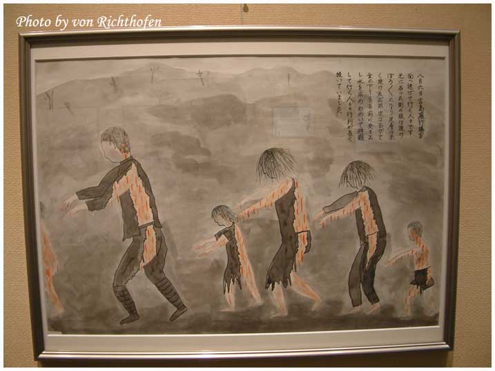 นี่ไงภาพที่แสดงในงาน เป้นภาพที่ชาวบ้านวาดกันขึ้นมาเล่าให้คนรู้ว่าคนที่โดนความร้อนและรังสีเผาแต่ยังไม่ตายที่เขาเห็นมันอยู่ในสภาพอย่างไร