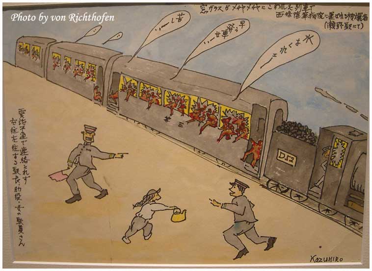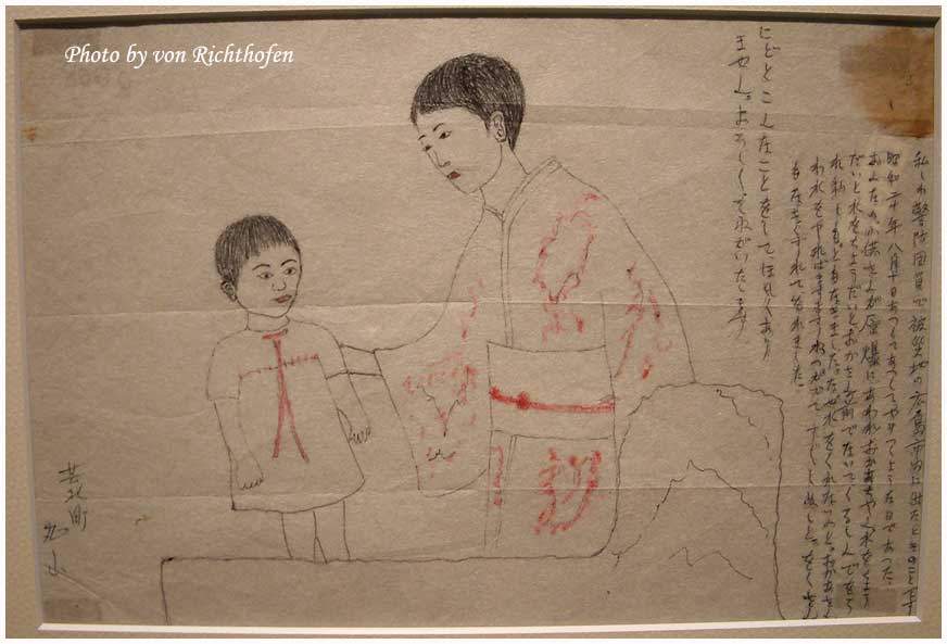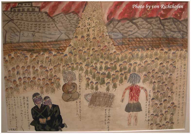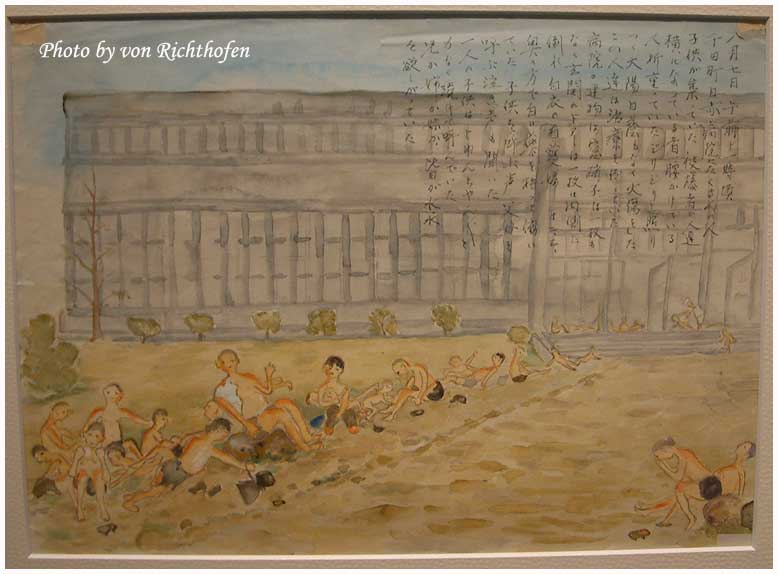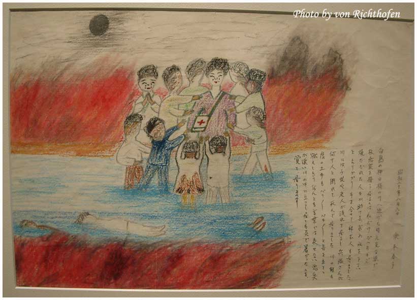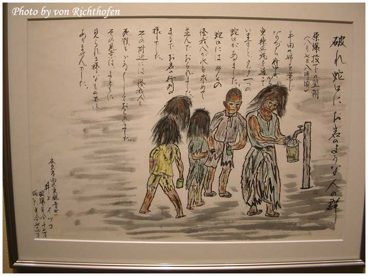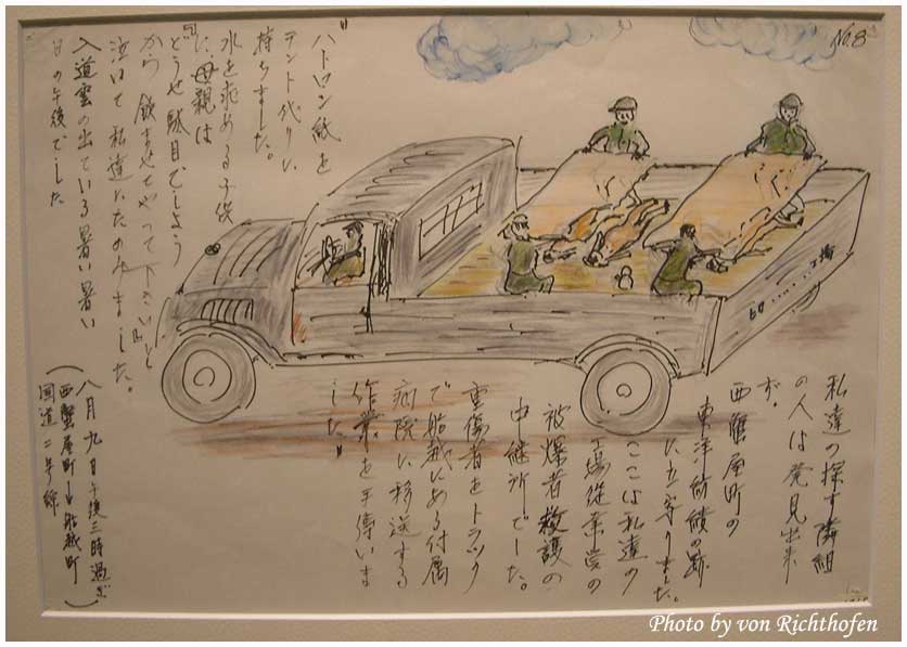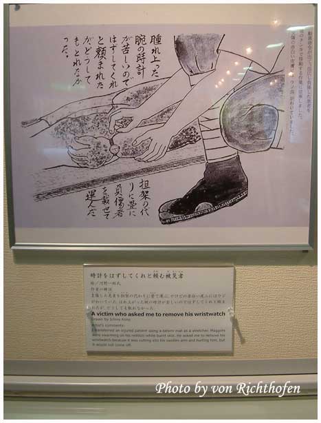 คนที่วาดได้บรรยายกว่าเขาใช้เสื่อตาตามิทำเป็นเปลหามช่วยเหลือผู้ที่ยังไม่ตายออกจากพื้นที่ เจ้าของนาฬิกาได้บอกให้เขาช่วยถอดมันออกทีเพราะว่าผิวหนังถูกเผาไหม้จนเกรียมและแขนบวมเป่งจนสายนาฬิการัดเข้ากับเนื้อที่ไหม้บวมจนเจ็บปวดทรมารมาก