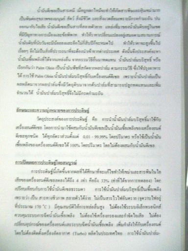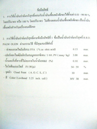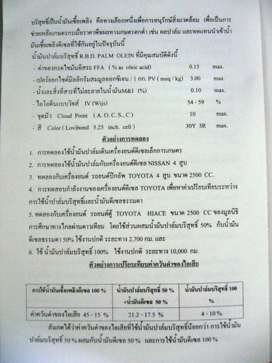 ผมเริ่มตื่นจากความคิดเรื่องน้ำมันพืชมี Gum สูงจนใช้ได้ไม่ดี ลองศึกษาน้ำมันปาล์มโอเลอีนอีกครั้ง เพราะคุณสมบัติของน้ำมันปาล์มโอเลอีนสูงกว่าน้ำมันอื่นๆที่ฝรั่งหัวแดงใช้แล้วบอกว่าไม่ดี เช่นน้ำมันถั่ว น้ำมันลีนซีด น้ำมันมะกอก น้ำมันจากพืชอื่นๆ ตรงที่ปริมาณ กรด และ กัม น้อยกว่ามาก สรุปได้ว่า น้ำมันปาล์มผ่านกรรมวิธีสกัดแบบโอเลอีนที่ให้คนกินมีคุณสมบัติดีกว่าน้ำมันให้รถวิ่งอย่างปลอดภัยเสียอีก