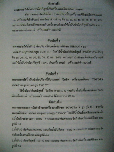 เมื่อตอนต้นเดือนไปงานแต่งงานลูกของอาจารย์ท่านหนึ่ง ท่านก็บอกว่าตอนนี้รถในหน่วยงานของท่านเติมน้ำมันพืชมาหลายปีแล้ว ท่านซื้อน้ำมันพืชจากโรงงานครั้งละ หมื่นลิตรใส่รถบรรทุกมาเติมลงถังน้ำมันหลังตึกเรียนแล้วแบ่งกันใช้ระหว่างอาจารย์ด้วยกันรวมถึงนักศึกษาที่ขับรถมาเรียนด้วย ตอนนี้รถทุกคันที่แบ่งน้ำมันพืชใช้ถ้าเอาระยะทางรวมกันก็หลายล้านกิโลเมตรแล้ว