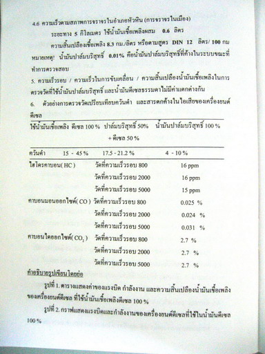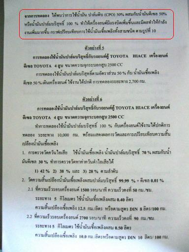 ครื่องทั้งสองตัวถูกตั้งแรงม้ามาให้อยู่ในค่ามาตรฐานทั้งคู่มีความแตกต่างเพียงแค่ 1-2 % แต่เมื่อใช้เชื้อเพลิงที่ต่างกันกลับพบความแตกต่างในระดับ 10% กว่า ซึ่งมีนัยสำคัญอย่างแน่นอน คุณบอยอยากให้ทดสอบโดยสลับเครื่องกันบ้างก็เป็นไอเดียที่ดีแต่ทั้งนี้ต้องคำนึงถึงการสึกหรอที่แตกต่างกันไปแล้วด้วย ซึ่งอาจจะเป็นประเด็นให้ถกเถียงกันอีกได้ ผมไม่ได้ทำการทดสอบเองแต่ขอข้อมูลจากคนสนิทที่ทำงานอยู่ในส่วนนี้มา การสลับเครื่องอาจจะทำให้สามารถศึกษาในประเด็นหัวข้อที่ว่า หากเครื่องที่ใช้ปาล์มในระยะเวลานานกลับมาใช้ดีเซลจะให้ผลอย่างไรได้ ซึ่งน่าสนใจไม่น้อย ตรงนี้ผมคงต้องไปถามคนทดสอบก่อนว่ามีข้อมูลหรือไม่ คุณบอยสงสัยไหมครับว่ากระทู้นี้คุยกันมาเนิ่นนานมาก แต่ไม่เคยมีการทดสอบอย่างจริงจังและควบคุมตัวแปร แค่วัดสมรรถนะและอัตราความสิ้นเปลืองก็ไม่เคยมีใครเอาข้อมูลมาให้ดู พูดกันด้วยความรู้สึกมาตลอดหรือวัดกันแบบวิ่งบนท้องถนนแล้วก็มาบอกต่อกัน มันเชื่อถือได้หรือครับ ทำไมไม่ลองวัดกันเลยล่ะครับ ทีจัดงานฉลองใหญ่โตใช้เงินมากกว่าไปหาแท่นทดสอบตั้งมากยังทำได้ มันน่าสังสัยไหมครับว่าอาจจะมีการปกปิดอะไรหรือป่าวหรือมีผลประโยชน์อะไรซ่อนเร้นหรือป่าว