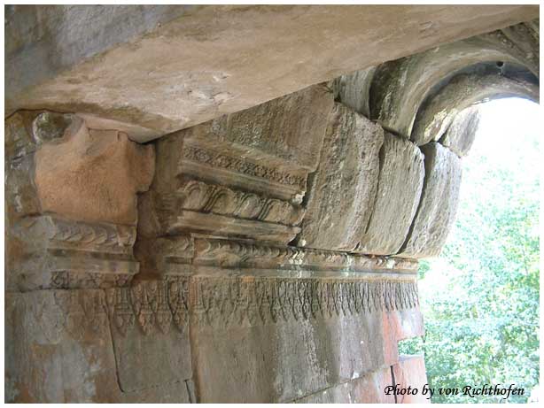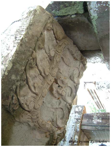 ลายสลักที่ยังคงเหลืออยู่เป็นศิลป์บาเค็งที่ปาดหินเหมือนเนยอ่อนๆ ก้อนนี้เป็นทับหลังก่อนจะเข้าไปในห้องชั้นในสุดของชั้นสาม น่าจะเป็นห้องที่นางนาครออยู่