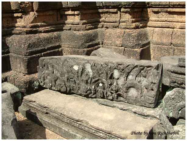 ชิ้นนี้วางกองอยู่สะดุดตาน่าจะเป็นทับหลังของห้องใดห้องหนึ่งที่พังไปแล้ว