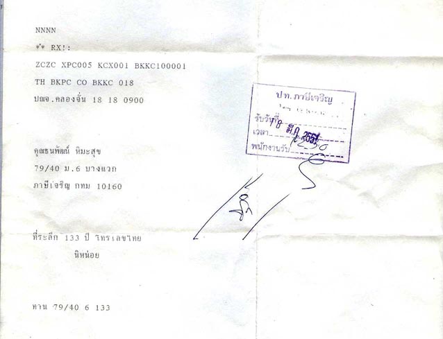 นิหน่อยส่งให้ 10 ท่านค่ะ โดยหัวหน้าพิทักษ์ รับปากว่าจะทยอยส่งให้โดยระบบโทรเลขจริง ๆ (บางท่านอาจจะยังไม่ได้เนื่องจากสัญญาณไม่ดีก็จะไม่ส่งให้ - เพราะอยากให้ได้รับแบบตัวจริงเท่านั้นค่ะ เนื่องจากได้แจ้งทางหัวหน้าไปแล้วว่าต้องการเก็บไว้เป็นที่ระลึก ) ดังนั้นคำขอบคุณที่นิหน่อยได้รับขอยกให้หัวหน้าพิทักษ์แห่ง ปทจ.คลองจั่นค่ะ