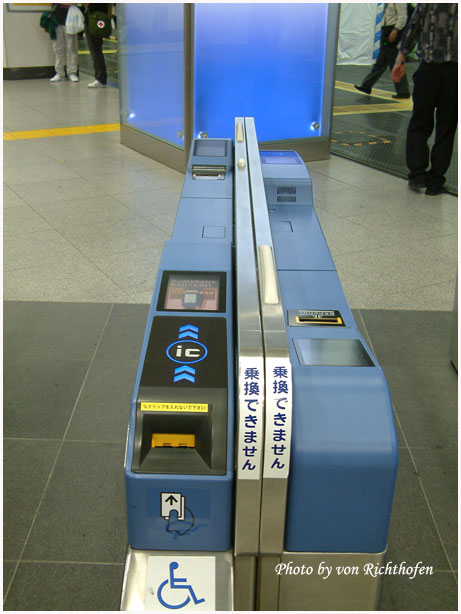 ที่เห็นเป็นเครื่องอ่านตั๋วแบบหลายอย่างคืออ่านทั้งตั๋ว JR ตั๋ว Toei line ตั๋ว Metro line เพียงสอดเข้าไปก็จะดูดตั๋วไปอ่านด้วยความเร็วสูงกว่าที่คนเดินผ่านช่องเสียอีก คนยังไปไม่ถึงตั๋วที่อ่านแล้วและถูกปรุไปโผล่รอที่ปลายทางให้หยิบแล้ว
