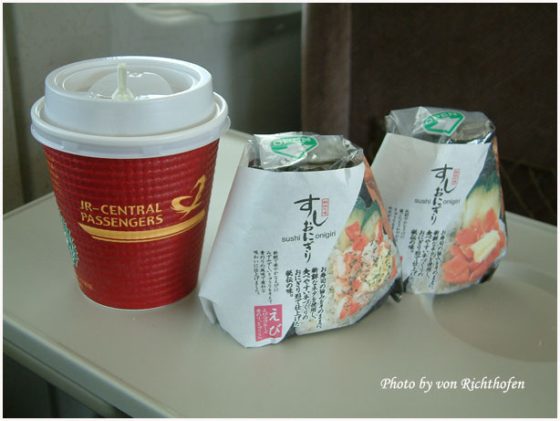 ได้กาแฟ ข้าวปั้นสาหร่ายตามเดิมแก้หิวตามมีตามเกิด เดี๋ยวถึงนาโกย่าแล้วค่อยหาของกินก็ได้