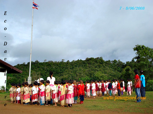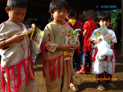 แจกของเล่นเด็ก ๆ แล้วก็มาเข้าแถวเคารพธงชาติ